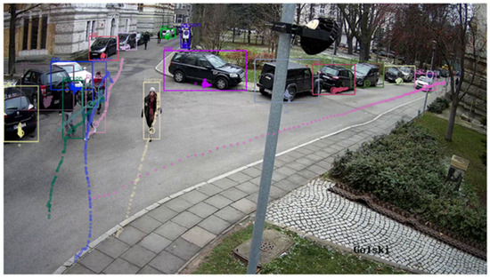 The object detection stage finished with a description of each video frame containing a list of recognized objects, their on-screen coordinates, as well as a set of auxiliary data such as confidence level, frame number, timestamp, etc. An example of a single frame with plotted rectangles around the detected objects and their extracted trajectories is shown in Figure 6.