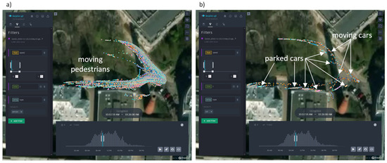 At this stage, the Kepler.gl online application proved to be a very handy tool for debugging purposes. It accepts trajectory collections saved in GeoJSON files. An example of a small trajectory subset recorded by the Golski camera and visualized with Kepler.gl is presented in Figure 7—separately, pedestrians (a) and cars (b). In this example, some small projection errors are noticeable in the areas located far from the camera due to insufficient calibration—this was fixed later.