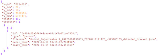 The spatial subsampling was implemented by dividing the area in question into a regular matrix of squares measuring 2 × 2 m. Each square was assigned the camera that offered the fewest detection errors. After the coordinate system conversion, each point from the trajectory of each detected object was classified as a visitor to that square, depending on its geographic coordinates. Data were collected on the visits of each object in each square, including the identifier, entry time, exit time, and object type (see Figure 8 for an example). After loading the data into the Mongo DB database, several statistical measurements were calculated for each quadrant, which were then visualized on a map. These measurements included the number of objects visiting each square, the total duration of all visits to the square, separate calculations for different types of objects (pedestrians, bicycles, cars, and trucks), detection of non-moving objects (such as parked cars), and the daily variability of these parameters.