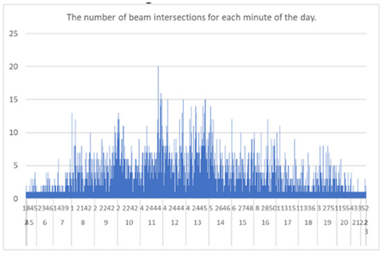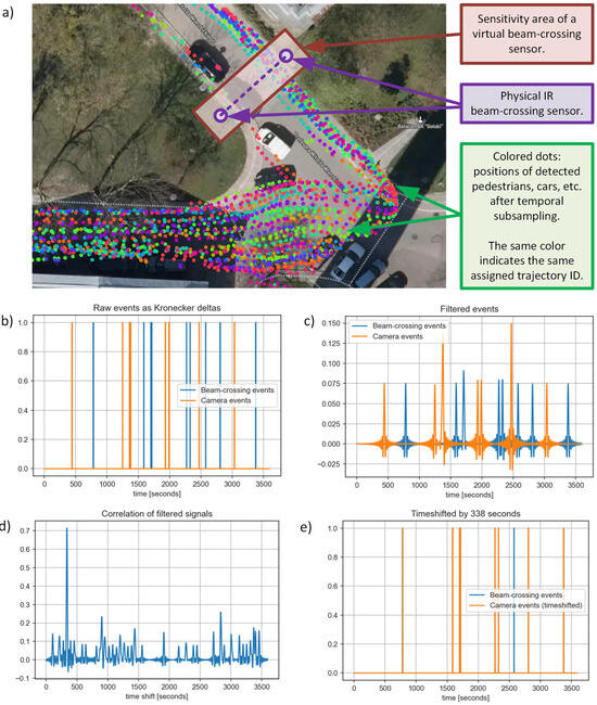 However, the unknown time offset between the beam-crossing sensors and CCTV cameras may still be present in the measurement data due to the lack of global time synchronization during the measurement session. As a solution, an automated approach for estimating the time shift was implemented. The method is based on cross-correlation calculated for two signals in the time domain. One signal represents the events of passing objects (people, cars, etc.) through a physical IR beam-crossing sensor. The other represents the same events, but the information is extracted from the video analysis subsystem as the intersection of the trajectory of detected objects, with a polygon representing the approximate sensitivity area of a “virtual beam-crossing sensor” located in approximately the same place as its physical counterpart (see Figure 9a). The timestamp of each event is calculated as the average value between the time of entry and exit from the area. The two signals are constructed in a similar manner. First, the sample rate is arbitrarily chosen as 1 sample per second. Both signals are created as zero-filled vectors with a length equal to the selected correlation length, such as 1 h (which corresponds to 3600 samples). Then samples at time positions corresponding to the time of the above-detected events are set to one (in other words: Kronecker deltas are inserted at these positions). An example is shown in Figure 9b—a fixed time offset between the two signals is visible and must be calculated. While the positioning of the virtual beam-crossing sensor on the map is not ideal, nor are the results of the entire video processing, including tracking and projecting objects’ positions on the map, which created some errors, through which direct calculation of the cross-correlation with such signals resulted in poor accuracy and confidence in estimating the time shift. A significant improvement was achieved after applying low-pass filtering, which expands the pulses (see Figure 9c). Finally, the timing of a single highest peak in the cross-correlation results is selected as the estimated time shift (Figure 9d). Once the time offset is eliminated, the two data sources are synchronized, and detection events can be analyzed on a common timeline (Figure 9e).
