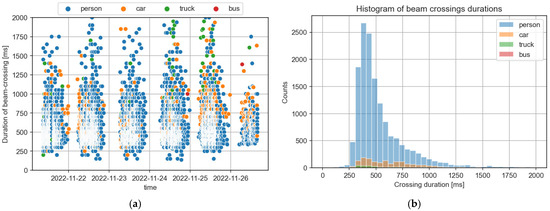 Another type of analysis is the cross-validation of results between those based on CCTV camera data and those based on beam-crossing sensor data. The consistency of the results obtained by two completely different methods potentially provides a high level of confidence for the overall methodology. While such a comparison may seem trivial at first glance, in reality it is not. The reason is the need for good time synchronization between the two data sources. Correct timestamps assigned to individual events are essential. The beam-crossing sensors were synchronized via a Network Time Protocol (NTP) with a time server accessible via the Internet at the time of installation. In practice, a relatively small (a few seconds per day) error was observed due to temperature drift of the quartz oscillator on the ESP32 board, but this is relatively easy to fix with repeated synchronization with CCTV-derived data.