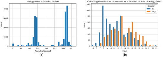 Interesting analyses can be performed on a trajectory basis instead of the spatially subsampled “visits in squares” described above. For this purpose, trajectories were processed by the MovingPandas Python library [65], which offers several valuable processing algorithms, like calculation of velocity, direction of movement, intersections, as well as enabling easy data exchange with other GIS tools using built-in exporters to, e.g., GeoJSON data format.