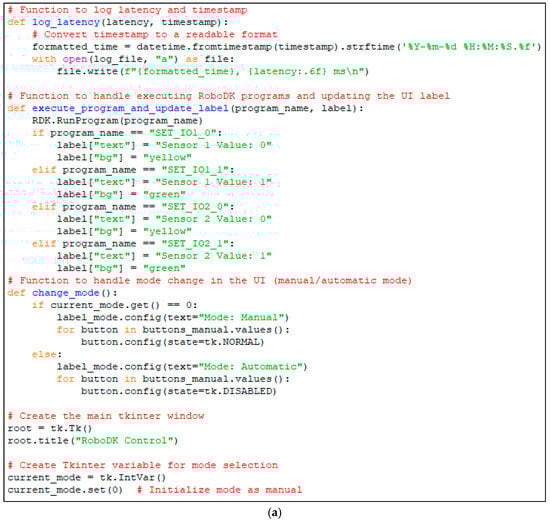 The read_arduino_data function is responsible for receiving sensor signals from Arduino and processing them in real-time within the RoboDK simulation. To ensure that only the most recent data are processed, the serial buffer is flushed before reading new inputs. This prevents outdated sensor values from being used, particularly when switching between manual and automatic modes. Additionally, a debouncing mechanism is implemented at the Arduino level to prevent rapid unwanted fluctuations caused by mechanical button noise. This enhances the reliability of digital signal readings, ensuring stable interactions between the physical and virtual environments. Finally, the function also records end-to-end latency measurements, which are crucial for evaluating the real-time performance of the system. Key features in accordance with the code structure are presented in Figure 15b.