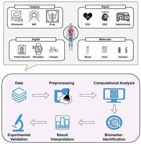 Recent advances in computational technologies are driving significant progress in clinics from a non-invasive perspective. The integration of artificial intelligence (AI), machine learning (ML), and high-throughput data analysis has enabled researchers to uncover complex patterns and predictive markers within large, multi-modal datasets spanning genomics, proteomics, metabolomics, and medical imaging [22,23,24]. These tools enhance the diagnostic accuracy of non-invasive biomarkers and facilitate the stratification of patients into clinically relevant subgroups, paving the way for personalized therapeutic strategies. Such progress is especially valuable for complex, multifactorial diseases like cancer, cardiovascular disorders, and neurodegenerative conditions, where early and accurate diagnosis is crucial. While computational advances have bolstered the potential of non-invasive biomarkers, computational challenges still remain. Translating AI-enhanced biomarker discoveries into clinical practice requires rigorous validation, standardized methodologies, and strong regulatory frameworks to ensure reliability and reproducibility [25]. Additionally, the limited access to advanced computational resources and diverse datasets poses a risk of further exacerbating disparities in healthcare [25,26,27,28]. In light of this, Figure 1 presents different types of non-invasive biomarkers and the principal stages of computational analysis. In more detail, the upper part of the figure highlights commonly utilized non-invasive techniques for biomarker identification across a broad spectrum of diseases and conditions, while the lower one delineates the sequential steps typically followed during computational analyses.