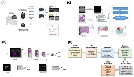 Collage of four representative image-based ML methodologies analyzed in this study. (A) showcases the method proposed by Sun et al. [32], (B) presents the approach described by Alfi et al. [33], (C) depicts the methodology outlined by Adjei et al. [36] and (D) illustrates the methodological framework introduced by Pillai et al. [46].
