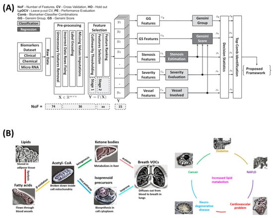 Collage of two indicative molecular-based non-invasive methodologies. (A) Methodology presented by Sajid et al. for risk stratification [45]. (B) Schematic illustrating the origin of breath VOCs from lipid metabolism and their association with conditions characterized by high lipid metabolic rates from the study by Souradeep et al. [74].