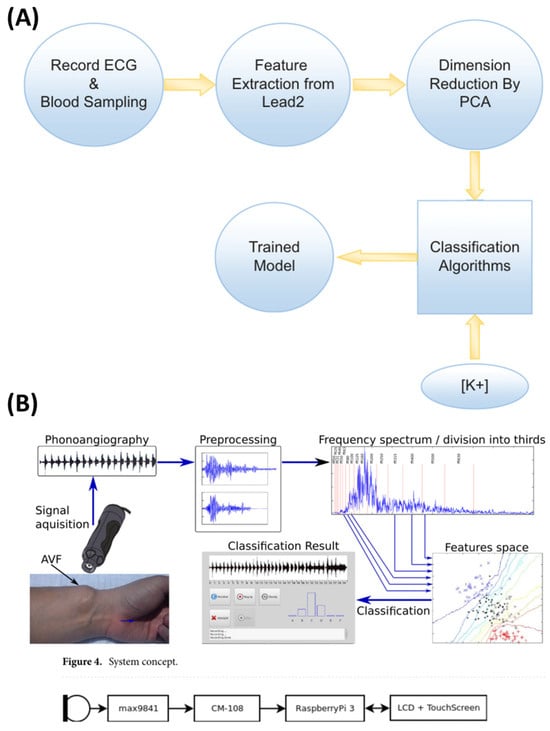 Collage of 2 indicative signal-based non-invasive methodologies. (A) A general chart outlining the study steps of Torshizi et al. [56] and (B) an overview of the hardware layer structure by Grochowina et al. [59].