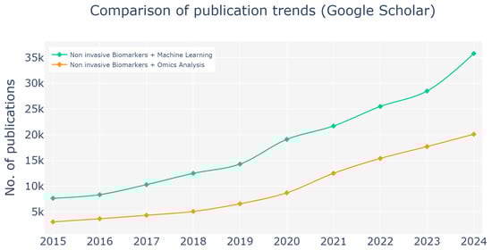 Publication trends from 2015 to 2024 (search on Google Scholar), highlighting the increasing focus on non-invasive biomarker methodologies. The analysis is centered on publications involving the terms “Noninvasive Biomarkers + Machine Learning” and “Non-invasive Biomarkers + Omics Analysis”. The observed rise in publications underscores the growing interest in these approaches within the field of biomarker research. A sharper increase is evident in studies referencing machine learning, reflecting its expanding role in advancing non-invasive biomarker applications. These trends emphasize the significance of both omics analyses and machine learning models and their potential in the development and enhancement of non-invasive diagnostic and prognostic tools.