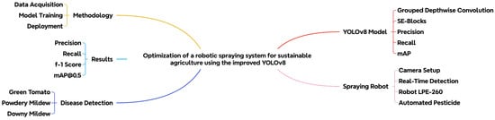 Figure 1 provides a visual summary of the key components and workflow of this research study. It highlights the main elements of the study, including the improved YOLOv8 model, the robotic spraying system, disease detection, and the methodology used for data acquisition, model training, and deployment. This overview helps readers understand the structure and objectives of this research study.