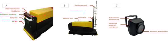 Figure 2A illustrates the essential components of the spraying robot interface, which includes the Machine Switch Key, Start Button, and Emergency Stop Button. The Machine Switch Key allows authorized users to activate or deactivate the machine, while the Start Button initiates its operation. The Emergency Stop Button is a critical safety feature, enabling immediate shutdown during emergencies to prevent accidents or equipment damage. Beneath these controls, the computer serves as the central processing unit, managing operations and ensuring the smooth execution of programmed tasks. Powered by a Battery, the system remains portable and can operate in areas without direct access to a power source. This compact and ergonomic design enhances user interaction, contributing to overall efficiency and ease of use. Figure 2B highlights the primary functional components of the robot, including the Liquid Storage Tank, Suction Pipe, and Liquid Spray Nozzles. The yellow Liquid Storage Tank serves as the main reservoir for the liquid to be sprayed, with the Suction Pipe transferring it to the Nozzles, which are mounted on a vertical metal frame to ensure even and precise distribution. This design optimizes the robot’s performance, making it ideal for tasks such as crop spraying, disinfection, and industrial applications. Additionally, the Spraying Robot LPE-260, shown in Figure 2C, is equipped with an integrated camera system that enhances its operational capabilities. The equipment was sourced from Jiangsu Greenport Modern Agricultural Development Co., Ltd., Suqian, China. This camera provides real-time visual feedback for monitoring, navigation, and data collection, enabling remote oversight of the spraying process. The captured data support autonomous navigation, helping the robot adapt to environmental conditions, and can be used for post-operation assessments, improving overall efficiency and effectiveness in agricultural and industrial tasks.