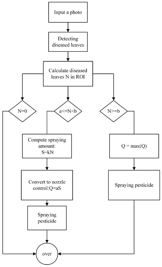 Figure 3 outlines a process for detecting diseased leaves in a photo, calculating the required amount of pesticide to be sprayed, and controlling the nozzle to apply the pesticide efficiently. The process begins with the input of an image, followed by detecting diseased leaves within the image. The number of diseased leaves, denoted by N, is calculated within the Region of Interest (ROI). If no diseased leaves are detected (), the process ends. If N is between predefined thresholds a and b, the spraying amount S is computed by using the relation . This amount is then converted to nozzle control parameters, where , and the pesticide is sprayed. If N exceeds the threshold b, the maximum spraying quantity, Q, is adjusted by taking the maximum value of Q, ensuring that the spraying amount does not exceed capacity for effective application.