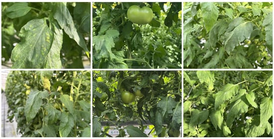 The dataset used in this study consists of 1500 images captured in Suqian, Jiangsu, China, at Jiangsu Green Harbor Modern Agricultural Development Co., Ltd. The images were collected under various environmental conditions, including varying lighting, occlusion, and natural interference, as shown in Figure 4. The dataset includes four class labels: ‘Green Tomato’, ‘Downy Mildew’, ‘Powdery Mildew’, and ‘All’. The ‘All’ label represents a comprehensive class for evaluating the performance of all other labels combined. The primary focus of the spraying system is on the diseased areas, specifically targeting the ‘Downy Mildew’ and ‘Powdery Mildew’ classes, which represent the unhealthy parts of the leaves requiring pesticide application. By concentrating on these affected areas, the system ensures more efficient use of resources, minimizing pesticide waste and reducing the environmental impact while effectively controlling the diseases.