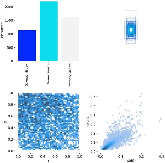 Figure 5 presents a detailed visualization of the distribution of instances from three categories related to tomato diseases: Downy Mildew, Green Tomato, and Powdery Mildew. The top-left bar chart highlights the number of instances for each category, with Green Tomato having the highest count, followed by Downy Mildew and Powdery Mildew. The scatter plots below provide further insights into the spatial distribution and relationships between different features of the instances. The plot on the bottom left shows the distribution of the y (vertical) and x (horizontal) coordinates for the instances, with a dense concentration in the middle, indicating that most instances are centrally located. The plot on the bottom right visualizes the correlation between the height and width of the instances, showing a positive trend where taller instances tend to also be wider. Figure 5 offers a statistical representation of the dataset, emphasizing the density of instances in certain regions and the relationships between the key features of the tomato disease instances.
