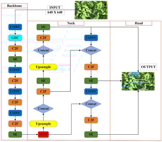 Figure 7 shows the architecture of an enhanced object detection model with three main components: Backbone, Neck, and Head. The input image (640 × 640) first passes through the Backbone for feature extraction. This stage includes convolutional layers, Grouped Depthwise Convolutions (GDCs), Cross Stage Partial with Focus (C2F), and Squeeze-and-Excitation (SE) Blocks to optimize feature representation by reducing redundancy and highlighting key features. The Neck aggregates multi-scale features for improved detection across various object sizes, using SE_Block, C2F layers, concatenation, and upsampling for effective feature fusion. A Spatial Pyramid Pooling-Fast (SPPF) block further improves multi-scale aggregation, creating a unified feature map for more accurate detection. The Head processes these features to generate final predictions, including class labels and bounding box coordinates, with additional convolutional layers and SE modules refining accuracy. GDC and SE_Block enhance model efficiency by capturing both fine details and long-range dependencies, which is crucial to detecting occlusions or subtle infections like Downy and Powdery Mildew. The model is optimized for real-time inference on edge devices, using depthwise separable convolutions to reduce computational cost and enable rapid decision making, essential to robotic systems in dynamic environments.