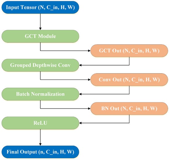 Figure 8 illustrates a modular data processing pipeline, starting with an input tensor of dimensions , where N represents the batch size, is the number of input channels, and H and W are the height and width of the tensor, respectively. The input tensor first passes through the Generalized Convolutional Transformation (GCT) module, which performs channel-wise transformations to enhance the model’s representational capacity. The output of this module retains the same dimensions as the input tensor. Next, the tensor undergoes a Grouped Depthwise Convolution operation, which applies depthwise convolutions within channel groups, focusing on spatial feature extraction while preserving the tensor’s overall shape. This results in an output tensor denoted by Conv Out . The tensor then undergoes Batch Normalization (BN), which standardizes features across the batch to stabilize and accelerate training. This step adjusts the mean and variance of the tensor’s features, resulting in an output tensor BN Out with consistent dimensions. The normalized tensor is then passed through a Rectified Linear Unit (ReLU) activation function, introducing non-linearity into the model by setting negative values to zero and keeping positive values unchanged. This ensures the tensor’s shape remains unchanged throughout the process. The final output tensor, with dimensions , is the result of this carefully structured sequence of operations, highlighting the combined effects of feature transformation, spatial filtering, normalization, and activation. In precision agriculture, where objects of interest—such as diseased areas on tomato leaves—are often small, occluded, or subject to variations in lighting and orientation, Grouped Depthwise Convolutions improve the model’s ability to efficiently detect these features. Unlike traditional convolutions, which apply filters across all channels, depthwise convolutions focus on spatial feature extraction for each channel group, reducing redundancy and enhancing performance in resource-constrained environments.