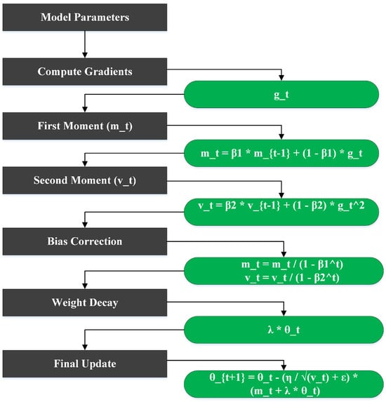 Figure 10 represents the workflow of the AdamW (Adam with Weight Decay) optimization algorithm, which enhances the standard Adam optimizer by decoupling weight decay from gradient updates for improved generalization in deep learning models. The process begins with the model parameters, which undergo gradient computation based on the loss function, yielding the gradient at time step t. The next step involves calculating the first moment estimate and the second moment estimate . The first moment accumulates the exponentially weighted average of past gradients by using Equation (1):