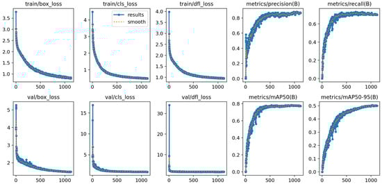 Figure 11 illustrates the training and validation performance metrics and loss curves for the improved YOLOv8 model across 1000 iterations. The results demonstrate the model’s optimization process and its ability to generalize to unseen data during validation. The graphs provide an in-depth view of the model’s behavior, including training and validation losses, as well as evaluation metrics. The training loss curves in the top row show the bounding box regression loss (train/box_loss), which steadily declines, indicating improved alignment with the ground truth. The classification loss (train/cls_loss) is consistently reduced, reflecting the model’s improved ability to differentiate among object classes, and the distribution focal loss (train/dfl_loss) decreases, highlighting improved precision in bounding box predictions. The evaluation metrics for training reveal increasing precision (metrics/precision), signifying a reduction in false positives. Recall (metrics/recall) steadily rises, indicating better detection of true positives. Similarly, the validation loss curves in the bottom row complement the training losses, with the validation box loss (val/box_loss) following a similar decline, confirming the model’s ability to generalize to unseen data for object localization. The validation classification loss (val/cls_loss) and distribution focal loss (val/dfl_loss) also decrease, suggesting reliable class and bounding box predictions. The validation metrics further highlight the model’s performance, with a steady increase in mean average precision at 50% IoU (metrics/mAP@0.5), demonstrating improved detection accuracy across all classes. There is also a consistent upward trend in mean average precision at 50–95% IoU (metrics/mAP@0.5:0.95), indicating the model’s robustness in detecting objects at varying levels of overlap.