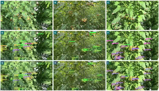 Figure 12 presents a comparative analysis of detection results from the original YOLOv8 model and the proposed improved YOLOv8 model across three image sets. The first row (A, B, C) shows the ground-truth annotations, including accurate bounding boxes and labels for the objects in the input images, which serve as the benchmark for evaluating model performance. The second row (D, E, F) displays detection results from the original YOLOv8 model, while the third row (G, H, I) shows outputs from the improved YOLOv8 model. A closer inspection reveals that the improved model consistently produces more accurate and comprehensive detection results than the original version. Notably, it shows better bounding box localization and fewer false positives. The improved model is also more effective in detecting smaller and more occluded objects, as seen in images G and H, where these objects would typically be missed. Additionally, the bounding box alignment in the improved YOLOv8 outputs is closer to the ground truth, indicating superior object localization and classification. This is particularly critical to our application, where the primary goal is to accurately detect and localize diseased areas on tomato leaves, such as Downy Mildew (yellow bounding boxes), Powdery Mildew (purple bounding boxes), and Green Tomato (green bounding boxes), for targeted pesticide application. The comparison highlights the effectiveness of the proposed improvements to YOLOv8, demonstrating significant advances in detection accuracy, object localization, and robustness in challenging scenarios.