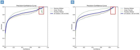 Figure 13 shows the precision–confidence curves for YOLOv8 (A) and the improved YOLOv8 (B), comparing their performance across three individual classes—Downy Mildew, Green Tomato, and Powdery Mildew—along with the overall performance across all classes. The thicker blue curve represents the aggregate precision for all classes, providing a general performance summary. For YOLOv8 (A), precision increases with higher confidence thresholds, but the model exhibits slightly lower precision for certain classes, particularly at moderate confidence levels. The ‘all classes’ curve reaches a maximum precision of 1.00 at a confidence threshold of 0.902, but there are noticeable gaps in precision consistency across the individual classes. This variability suggests that YOLOv8 struggles to maintain stable performance across different object types at specific confidence levels. In contrast, the improved YOLOv8 (B) shows superior performance, with higher precision across all confidence thresholds. The ‘all classes’ curve reaches a maximum precision of 1.00 at a confidence threshold of 0.918, indicating more consistent and robust detection compared with the original YOLOv8. Furthermore, the per-class curves (for Downy Mildew, Green Tomato, and Powdery Mildew) exhibit fewer fluctuations and higher precision, especially at lower confidence thresholds. This indicates that the improved YOLOv8 handles challenging detection scenarios more effectively, providing more accurate predictions across all object categories.