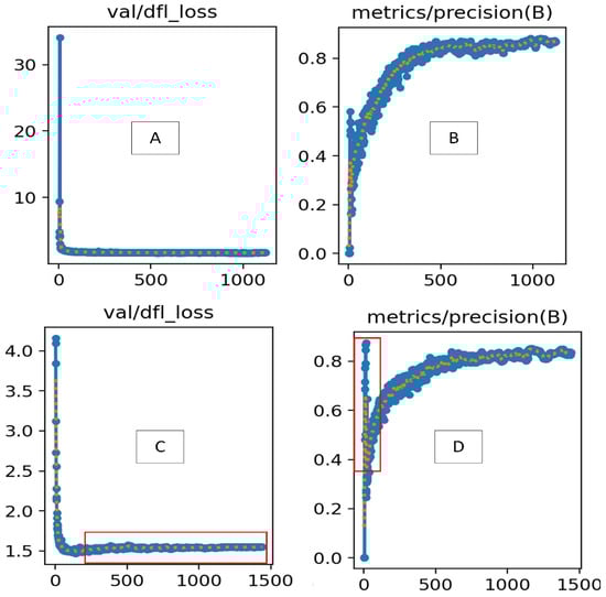 Figure 14 compares the improved YOLOv8 (A and B) with the standard YOLOv8 (C and D) in terms of validation loss (val/dfl_loss) and precision (metrics/precision). The top row shows results for the improved YOLOv8, while the bottom row displays the standard YOLOv8. In A (improved YOLOv8—validation loss), val/dfl_loss decreases rapidly during the initial training phase, stabilizing at a much lower value than the standard YOLOv8. This indicates the improved model’s better ability to refine bounding box predictions with higher precision and less variability, leading to faster convergence. In contrast, C (YOLOv8—validation loss) shows a higher loss plateau, indicating slower and less effective convergence. The red-marked region in C highlights a higher stabilized loss, suggesting that YOLOv8 struggles to optimize localization accuracy as effectively. In B (improved YOLOv8—precision), the precision steadily increases and reaches higher values, demonstrating improved detection accuracy. The curve is smoother, reflecting more consistent learning throughout training. In comparison, D (YOLOv8—precision) shows a similar upward trend but starts lower, with precision increasing more gradually. The red-marked region in D reveals greater fluctuations, indicating less stability in precision improvement. The improved YOLOv8 outperforms the standard YOLOv8 in both validation loss and precision. The reduced val/dfl_loss indicates better bounding box refinement, while the higher, more stable precision confirms enhanced detection capabilities.