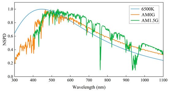 Following standard specifications for spectral irradiance distribution, the wavelength range of the AM0G solar spectrum is defined as 300 nm–1100 nm [23], whereas the AM1.5G solar spectrum covers the range of 400 nm–1100 nm [24]. These solar spectra exhibit complex spectral features that differ significantly from the smooth spectral profile of standard blackbody radiation (e.g., 6500 K) [25]. The standard blackbody radiation curve at 6500 K, along with the normalized spectral power distributions (NSPDs) for AM0G and AM1.5G solar spectra, is depicted in Figure 2.