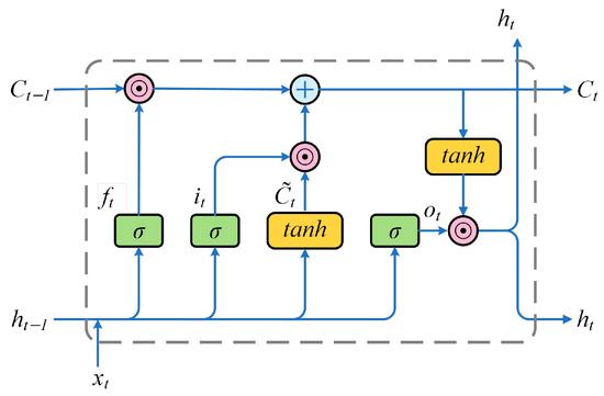 In Figure 3, and denote the input and output vectors, respectively. Moreover, , , and represent the activation values of the forgetting gate, input gate, and output gate, respectively; and indicate the cell status and its candidate value, respectively, while the subscript indicates the time step. The symbols and refer to the and activation functions, respectively. The weight matrix and bias vector are represented by and , respectively, and denotes the element-wise multiplication of two matrices.
