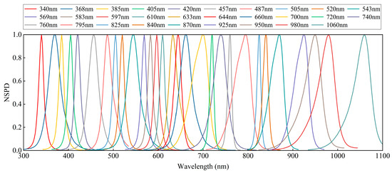 This study selected 29 narrowband LEDs as the base light sources to ensure high-quality solar spectral reconstruction based on (5) and (6) and existing narrowband LED resources. The normalized spectral power distributions (NSPDs) of these LEDs are depicted in Figure 4. The selected LED light source was introduced into an integrating sphere with a radius of 100 mm. The coating material of this integrating sphere is polytetrafluoroethylene, which has an extremely high reflectivity in the UV-VIS-NIR bands (0.25–2.50 μm) and ensures multiple diffuse reflections of the light inside the sphere to achieve a uniform distribution of the spectrum. The spectra at the exit of the integrating sphere were then collected using an AvaSpec-ULS2048XL-EVO fiber optic spectrometer (sourced from Avantes, located in Alphen aan den Rijn, Netherlands).