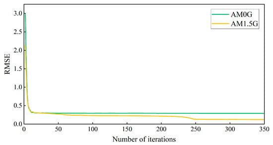 RMSE values as a function of training iterations for simulated AM0G and AM1.5G solar spectra.