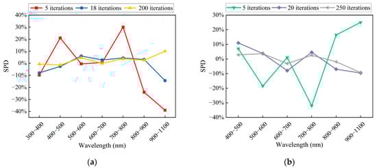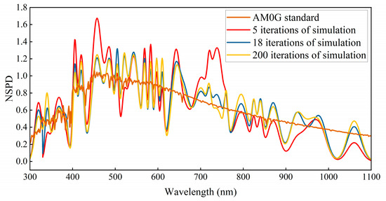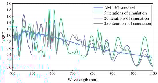 As seen in Table 2 and Table 3, the spectral simulations of both AM0G and AM1.5G have bands that do not meet the A-level standard at the beginning of the iteration (five iterations for both AM0G and AM1.5G). During the mid-iteration stages (18 iterations for AM0G and 20 iterations for AM1.5G), AM0G meets the A+ standard except in the 900–1100 nm range, while AM1.5G meets the A+ standard across all bands but is close to the allowable error limit of the A+ standard in the 400–500 nm and 900–1100 nm ranges. All spectral bands of AM1.5G satisfied the A+-level standard during the later iteration stages (200 iterations for AM0G and 250 iterations for AM1.5G). Specifically, bands within the 300–900 nm range for AM0G achieved the A+-level standard with the spectral simulation deviations constrained within ±4.5%. However, the 900–1100 nm band exhibited a simulation deviation of −10.5%. Similarly, the AM1.5G spectrum maintained deviations better than ±3.6% across all bands except for the 900–1100 nm range, which showed a simulation deviation of −9.3%. The relatively larger deviations in the 900–1100 nm range can be attributed to the limited variety of LEDs types available for this wavelength range among the 29 narrowband LEDs used in this study. The simulation met the A+-level standard despite these limitations. Expanding the variety of narrowband LEDs in the 900–1100 nm range is expected to further enhance matching performance owing to advancements in LED technology [34,35].