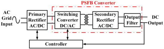 - Zhao, L.; Li, H.; Wu, X.; Zhang, J. An Improved Phase-Shifted Full-Bridge Converter with Wide-Range ZVS and Reduced Filter Requirement. IEEE Trans. Ind. Electron. 2018, 65, 2167–2176. [Google Scholar] [CrossRef]