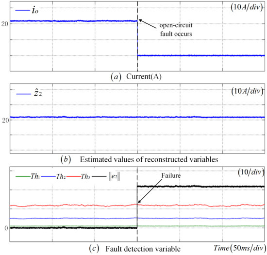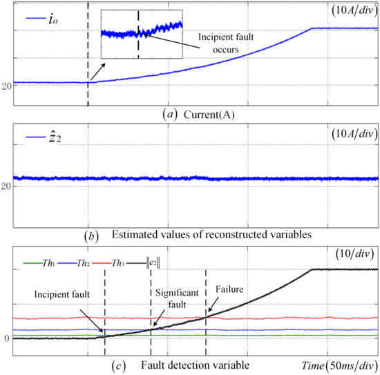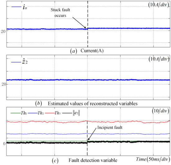 - To validate the robustness of the fault detection method proposed in this paper under load fluctuations, Figure 11 presents the diagnostic results of an incipient fault in the CS when the load resistance abruptly changes. Specifically, at s, the load increases to 1.2 times its original value, and an incipient fault occurs in the CS at s. Following the load fluctuation, there is a slight variation in the output current, and the fault detection thresholds undergo significant changes. Nevertheless, does not exceed the threshold, thus avoiding false alarms. When the CS fault occurs at 1.5 s, as depicted in Figure 10 and Figure 11c, the observer residuals sequentially exceed , , and , indicating the detection of an incipient fault, a significant fault, and a complete failure in the sensor, respectively.