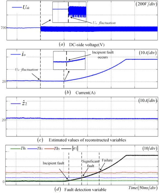 - To verify the robustness of the fault detection method proposed in this paper, Figure 9 presents the diagnosis results of the incipient fault in the CS under DC-side voltage fluctuations. In this scenario, a DC-side voltage fluctuation is introduced at s, followed by an incipient fault in the CS occurring at s. Upon the introduction of the DC-side voltage fluctuation at s, the output current experiences slight fluctuations; however, remains close to zero, indicating no false alarm. Subsequently, when the CS fault occurs at 1.5 s, as depicted in Figure 9d, sequentially exceeds , , and , demonstrating that the proposed fault detection method successively identifies the occurrence of an incipient fault, a significant fault, and a complete failure in the sensor.