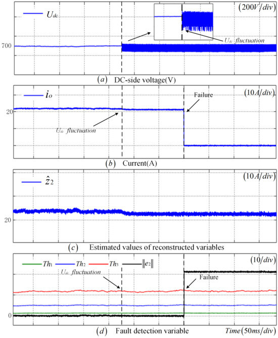 Figure 9. Robustness verification results of the CS incipient fault under DC-side voltage fluctuations. - To demonstrate the robustness of the fault detection method introduced in this paper, Figure 10 displays the diagnostic results for a CS disconnection fault under fluctuations. In detail, fluctuations are introduced at s, followed by a CS disconnection fault at s. Despite slight fluctuations in the output current following the fluctuations after 1 s, remains stable near zero and avoids triggering any false alarms. Nevertheless, upon the occurrence of the CS failure at s, Figure 10d clearly illustrates that surpasses the rapidly, confirming the successful detection of the sensor failure by the fault detection method presented in this paper.