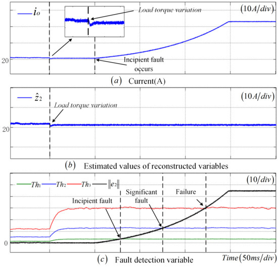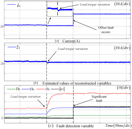 Figure 11. Robustness verification results of the CS incipient fault under load torque variation. - To assess the robustness of the fault detection approach introduced in this paper when subjected to load torque variation, Figure 12 demonstrates the diagnostic results of a CS offset fault scenario where the load torque abruptly rises to 1.2 times its initial value. The load change takes place at s, followed by the occurrence of a CS offset fault at s. This load torque variation leads to minor fluctuations in the output current and necessitates a substantial adjustment in the fault detection threshold. Nevertheless, remains below the predefined threshold, thereby avoiding any false alarms. Upon the actual manifestation of the CS fault at s, as depicted in Figure 12c, the observer’s residual experiences a rapid increase and exceeds , confirming the successful identification of the significant fault by the fault detection method presented in this paper.