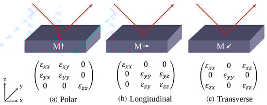 The optical properties of a medium can be macroscopically described by a permittivity tensor, represented by a 3 × 3 matrix in three-dimensional space. In an isotropic medium, this matrix is diagonal, and all entries are equal. The incidence of a static magnetic field in a ferromagnetic material tends to align magnetic moments within the sample, creating a net magnetization within the magnetic layer. The effects of the magnetization can be formally represented by the insertion of off-diagonal elements in the permittivity tensor of the ferromagnetic layer that describe magneto-optical effects in the different configurations, as depicted in Figure 1. For the case of TMOKE, the off-diagonal parameter is proportional to the magnetization M and the Voigt constant V in the following manner: