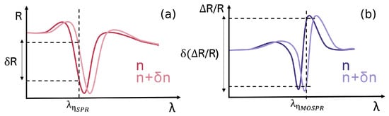 The interrogation wavelength for each spectrum is that of the maximum value of and , being the wavelength of largest reflectance variation for a given RI change. For a certain set of parameters, the high slope of the MOSPR signal will result in high reflectance variations at the interrogation wavelength for an RI shift, rendering high sensitivities and increasing the performance capacity of a given structure (Figure 2).