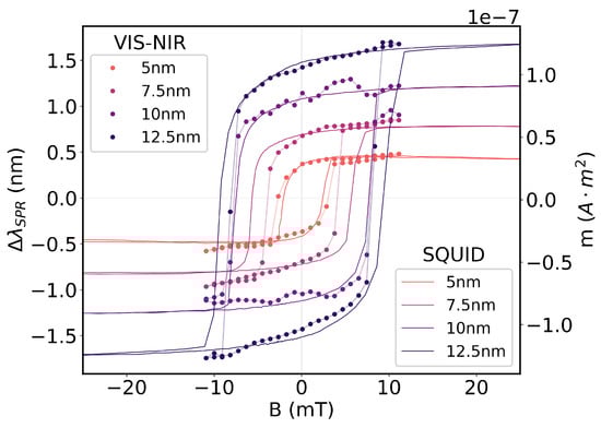 The magnetic characterization of the magnetoplasmonic thin films was carried out for Ag/Fe bilayers with varying thicknesses of the Fe layer to study the impact of the thickness of ferromagnetic material on the magnetic response of the bilayer structure. Two identical batches of four bilayer films were deposited under the same experimental conditions, one for characterization of the hysteresis cycles by spectroscopic interrogation of the resonance wavelength, and the other for characterization of the hysteresis cycles with SQUID measurements. Each batch consisted of four thin films with 15 nm of Ag and 5, 10, 7.5, or 12.5 nm of Fe.