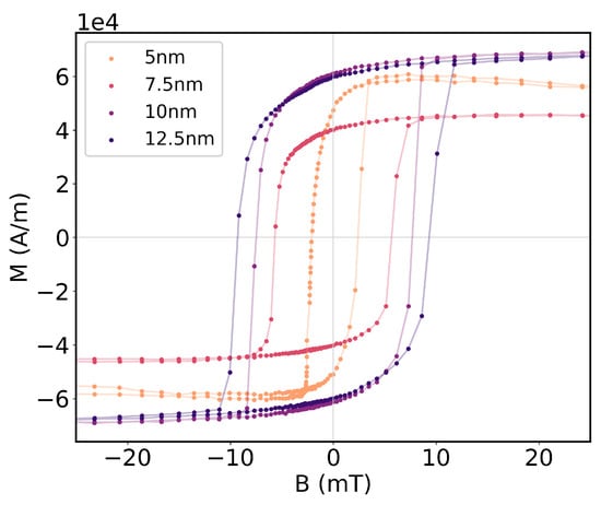 Magnetic characterization by SQUID (Quantum Design MPMS3, Quantum Design, San Diego, CA, USA) allows stable and precise measurement of magnetic flux, from which a quantification of magnetic moment, m, within the magnetic sample can be obtained. For the characterization of the hysteresis cycles, identical samples were fabricated on smaller substrates, and were characterized at room temperature for magnetic fields ranging from −50 to 50 mT. From the magnitude of the saturation magnetic moment, the saturation magnetization, M, can be estimated considering the dimensions of the sample by