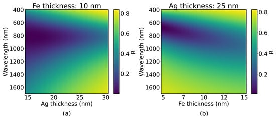 (a) Reflectance spectra of Ag/Fe bilayers for varying thicknesses of the Ag layer and a fixed 10 nm Fe layer; (b) reflectance spectra of Ag/Fe bilayers for a fixed 25 nm Ag layer and varying thicknesses of the Fe layer.