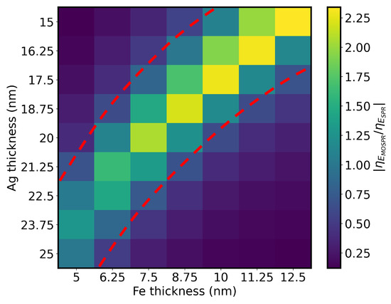 The MOSPR bands were determined from the measured SPR spectra for opposite saturation magnetizations. Both and were determined and Figure 7 depicts a matrix expressing the ratio for the different thickness combinations of Ag/Fe bilayers, showing significant variations for slightly different deposited thicknesses. The structures with the highest ratio are in the diagonal delimited by the red dashed lines. From these, it can be seen that the structure with 15 nm of Ag and 12.5 nm of Fe has the highest magnetoplasmonic enhancement of RI sensitivity.