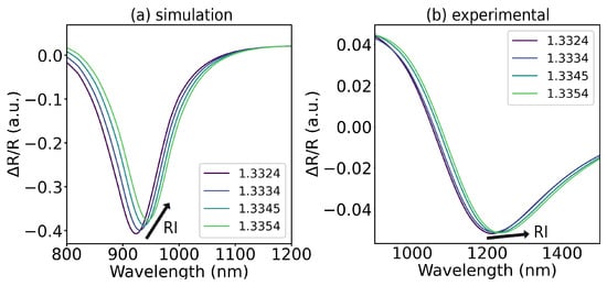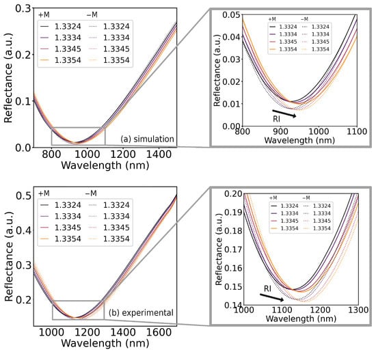 MOSPR reflectance spectra, as defined in Equation (2), of 15 nm Ag/12.5 nm Fe bilayer for symmetric saturation magnetizations and different RIs: (a) simulation and (b) experimental.
