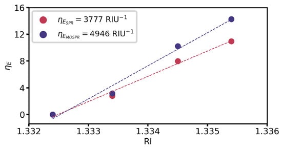 These small mismatches impact the measured RI sensitivity in reflectance interrogation for SPR and MOSPR spectra, falling short of the simulated two-fold MOSPR enhancement. Nonetheless, an enhancement is still attained, with an MOSPR sensitivity enhancement of 30% over the obtained RI sensitivity for SPR interrogation, as shown in Figure 10.
