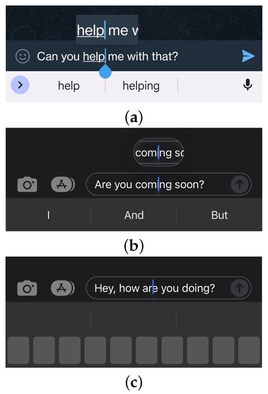 Text-based methods contrastingly work at the character or word level to suggest potential next characters or to correct typing mistakes. Autocomplete offers word suggestions after the first few letters typed to reduce the keystrokes for a word or sentence []. Autocorrect on the other hand provides suggestions for mistyped words but requires a word separation character (such as space or period) [,]. These methods are not without disadvantages: While Autocomplete reduces the number of characters to type a word, the user must attend to, consider, and click on potential suggestions. This negatively impacts typing speed [,]. In addition, although current Autocorrect algorithms are accurate, they often fail to offer sensible correction suggestions for misspelled names and other proper nouns, or even worse, actively change correct words into an assumed, corrected counterpart, requiring the user to manually intervene []. This mainly affects non-western names and nouns (e.g., correcting “Shinobu” into “Shining”), which led to campaigns against discrimination in Autocorrect, such as “Elimn8Hate” (https://www.namereclaim.ca; accessed on 23 February 2025) and “I Am Not a Typo” (https://www.iamnotatypo.org; accessed on 23 February 2025), the latter of which was founded by journalist Dhruti Shah and law professor Rashmi Dyal-Chand, who regularly found their names corrected into Dorito and Sashimi, respectively []. English sociolects, such as the African American Vernacular English (AAVE), and the many popular modern slang terms borrowed from them, are also affected [,].