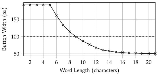 Depending on the size of the word to correct, the character buttons in TapFix automatically adjust their size to fit the screen. Starting at a width of 64 pt and a height of 50 pt (points) for words up to 8 characters, buttons decrease in width down to 17 pt at 21 characters in order to still fit on the screen. On Retina devices, the number of pixels depends on the scale factor. For all iPhones released since 2020 (with the exception of the SE models), this factor is , thus 1 pt will scale by 3 px (pixel) into each dimension. The default character button width on the English (US) keyboard is 100 px. So, for up to 9 characters inclusive, TapFix characters will be at least as wide as a regular keyboard character. The scaling curve for the width of TapFix character buttons is shown in Figure 4. The effect of the character button width and the target word length in general is investigated as part of the experiment.