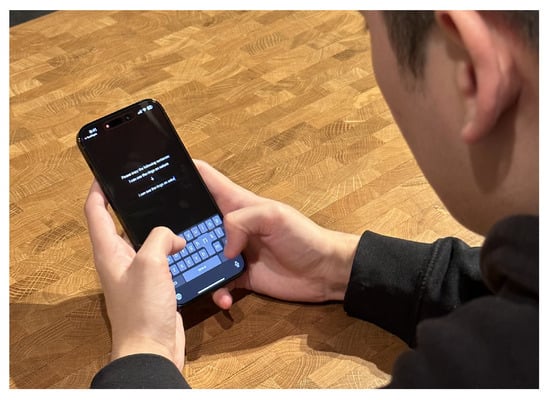 - MacKenzie, I.S. A Note on Calculating Text Entry Speed, 2022. Available online: https://www.yorku.ca/mack/RN-TextEntrySpeed.html (accessed on 23 February 2025).