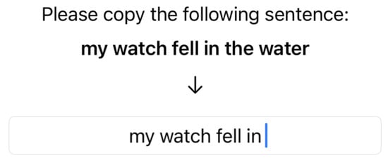 - MacKenzie, I.S.; Soukoreff, R.W. Phrase sets for evaluating text entry techniques. In Proceedings of the ACM SICHI Conference on Human Factors in Computing Systems—CHI ’03, Florida, FL, USA, 5–10 April 2003; ACM: New York, NY, USA, 2003; pp. 754–755. [Google Scholar] [CrossRef]