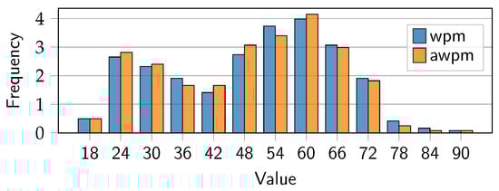 For the warm-up trials, despite not correcting mistakes, participants achieved an average accuracy of (SD = ) over all 20 trials, with a minimum of and a maximum of . These accuracy numbers were calculated using the Levenshtein minimum string distance between the typed string and the correct string []. Participants took on average (SD = ) to type a sentence. Considering the average sentence length to be characters (SD = ), this resulted in an average typing speed of wpm (SD = ), calculated according to MacKenzie [], and wpm adjusted for accuracy (awpm). The distribution of typing speeds is shown in Figure 8.