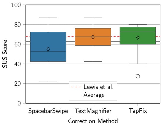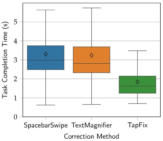 The grand mean for task completion time was . The mean times per correction method were for SpacebarSwipe, for TextMagnifier, and for TapFix. As such, TextMagnifier trials were faster than SpacebarSwipe trials, and TapFix trials were faster than SpacebarSwipe trials and faster than TextMagnifier trials. The distribution of the results, as well as minimum and maximum values, is seen in Figure 9. Note that data points above the upper fence are omitted in order to prevent distortion and retain readability of the plot.
