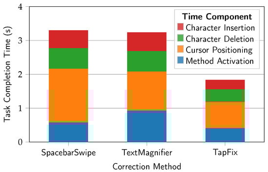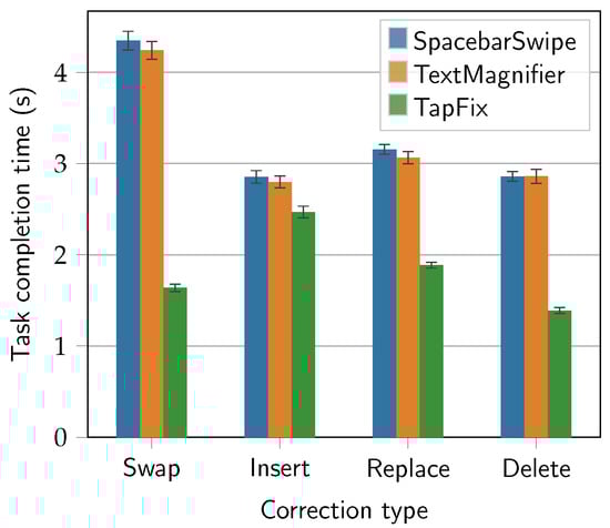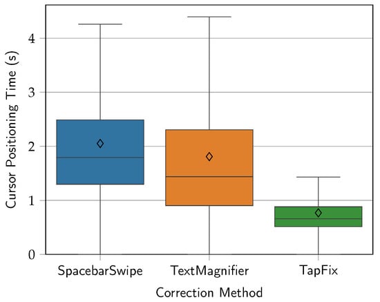The dependent variables were task completion time () and cursor positioning time (). The latter time was measured as the time for participants to touch the erroneous character (TapFix) or to place the cursor behind the character to be corrected (SpacebarSwipe and TextMagnifier).