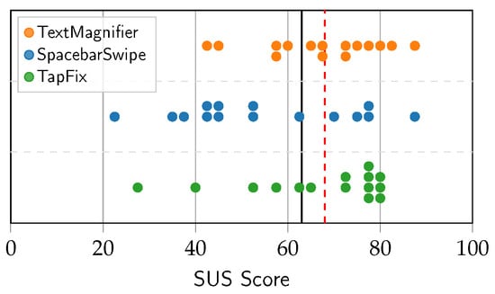 Zhang et al. [] present three methods to circumvent the issue of cursor placement. They allow the user to type a correction, then either drag it onto the erroneous word (Drag-n-Drop), flick it in the direction of the word (Drag-n-Throw), or use a Magic Key. Magic Key automatically highlights preceding words using a neural network to choose words most likely to be typos and allows the user to immediately apply the correction. The authors found a statistically significant effect of correction method on the average text correction time, with their proposed methods up to 1.8 s faster than the traditional cursor-based method. The only outlier was Drag-n-Drop, which slowed down text insertions beyond the average speed of the traditional method. Furthermore, when asked to rate usability on a System Usability Scale (SUS) questionnaire [] and workload on the NASA Task Load Index (TLX) [], participants showed a slight preference for the three new methods over the traditional method. However, success rates were 88% to 97%, leaving these methods in the range of traditional Autocorrect [].